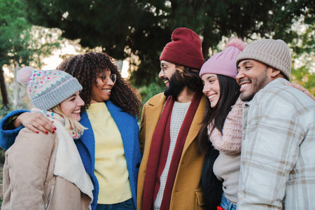 Group of young people smiling and talking outdoors with autumnal clothes. Multiracial friends having fun and having a conversationin a park at weekend.