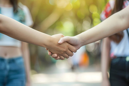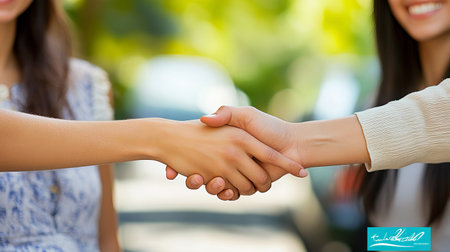 Two hands shake firmly in agreement, representing a moment of connection and mutual understanding between the individuals. The setting is natural and serene.