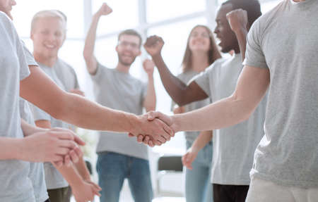 Close-up of a handshake between two individuals in a casual business setting, symbolizing agreement, partnership, and collaboration.