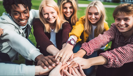 Circle of school friends joining hands, symbolizing unity, teamwork, and friendship