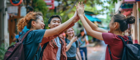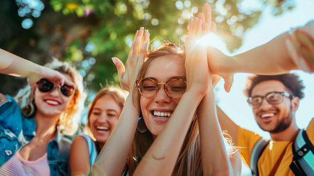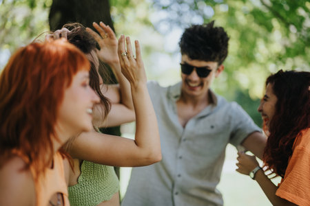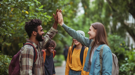 Friends sharing a high five during a cheerful outdoor gathering in a lush park on a sunny day