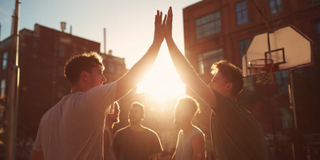 Friends celebrating on a basketball court during sunset with bright sun behind them