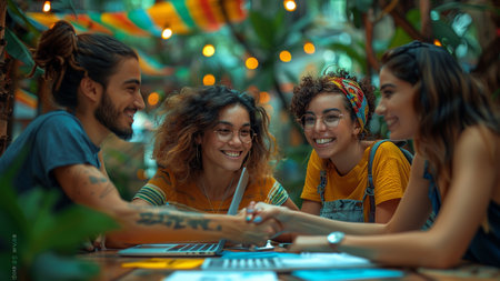 Diverse group of friends joyfully stacking hands together in a collaborative gesture, showcasing teamwork and unity in a vibrant workspace filled with greenery and natural light