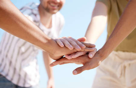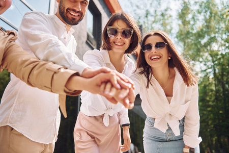 Holding hands together. Conceptin of unity. Three friends having great weekend outdoors together.