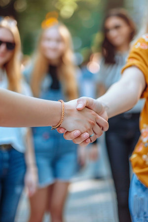 Close-up of two people shaking hands outdoors. Shallow depth of field.