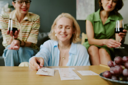 Three women sitting together, smiling and holding wine glasses, middle aged woman in foreground placing tarot cards on table, group engaging in tarot reading activity