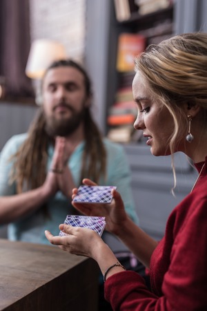 Tarot cards pack. Nice young woman shuffling the tarot cards while thinking about her destiny