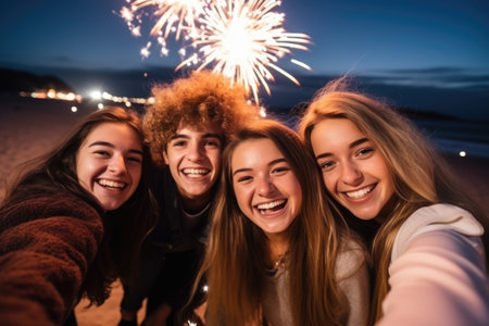 Group of young girls and boys friends celebrate New Year's Eve with drinking glasses with Generative AI