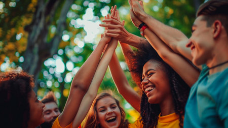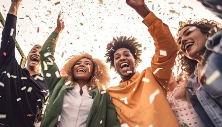 A diverse group of people celebrate an event outdoors. They are smiling and raising their arms as confetti falls around them. The composition features warm colors, suggesting a sunny day. This image may be used for various commercial purposes, including marketing and advertising campaigns.