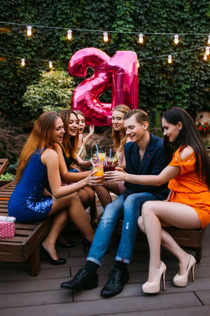 Congratulation 21st birthday party. Happy friends. Atmospheric summer place outdoors, joyful company with drinks. Modern lifestyle, friendship concept