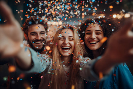 A group of happy people throwing colorful confetti in the air, smiling and cheering together.