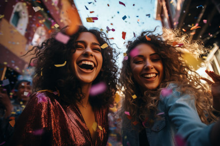 Two happy young women laughing amidst a shower of colorful confetti, capturing a moment of pure joy and celebration.