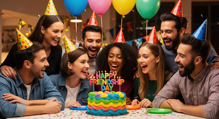 A group of diverse friends are gathered around a table, celebrating Friendship Day. They are all smiling and laughing, wearing party hats, with colorful balloons and confetti in the background. A rainbow-colored cake with lit candles spelling FRIENDSHIP DAY is in the center of the table.