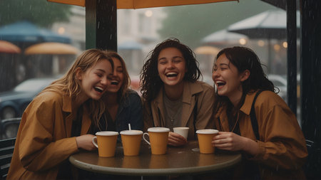 A group of three women are sitting at a table laughing with four cups of coffee, In rainy. ai