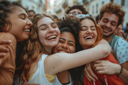 Diverse group of friends laughing and embracing each other in a warm hug, A diverse group of friends laughing and hugging in a bustling city square