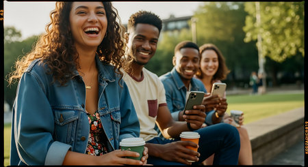 A young, diverse group of friends enjoying a sunny day together. Capturing happy moments with smartphone selfies. Lifestyle concept showing joy and friendship in a group.