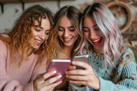 Two young women sit closely together, intently focusing on a smartphone. Their hairstyles vary, and the backdrop features greenery, creating a serene atmosphere in the afternoon.