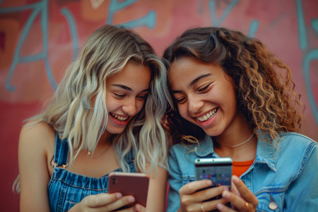 beautiful and young girls having fun and looking at their cell phones, taking photos and walking around the city happy and smiling on a sunny day