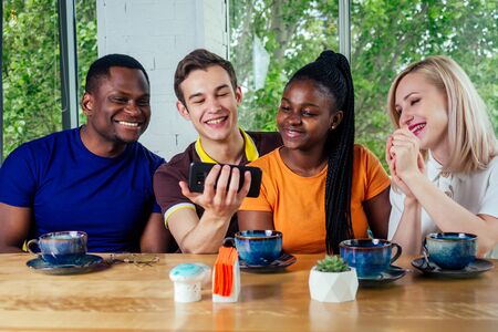 Group of young african american and caucasian friends using mobile phone and drinking coffee outdoors