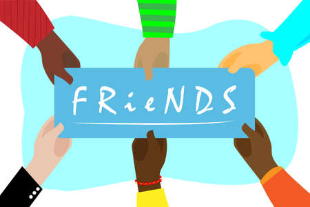 The hands of a diverse group of people are holding a sign saying - Friends. Concept of community, support, partnership, teamwork, social movement, friendship and cooperation. Flat vector illustration.