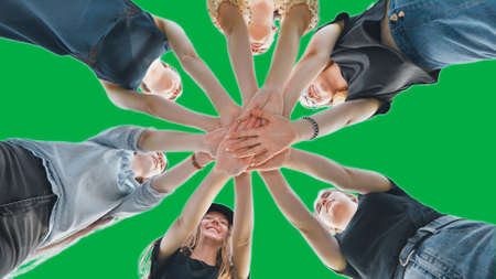 Low angle view of multiracial female friends stacking hands in unity and support looking at camera.
