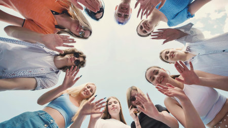 Circle of school friends joining hands, symbolizing unity, teamwork, and friendship