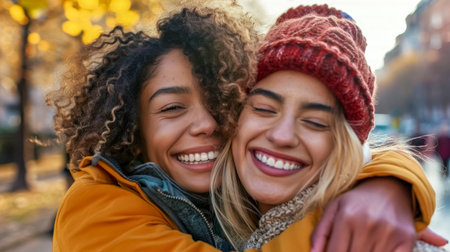 Two joyful friends embrace outdoors, showcasing their happiness and connection. This candid moment captures the essence of friendship in a vibrant autumn setting.