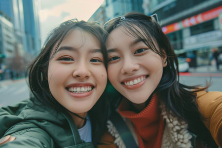 Two happy friends taking a cheerful selfie in an urban street capturing their bright mood and good times