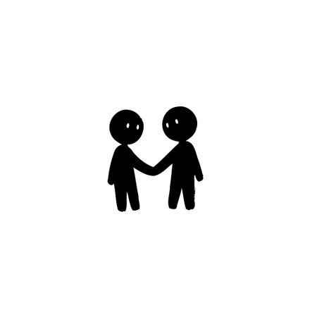 A simple black and white graphic displaying two stylized figures engaging in a handshake, portraying a theme of collaboration, agreement, and connection.