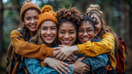 Group of friends smiling and looking at camera in forest. Group of young women standing together and looking at camera.