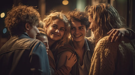 A diverse group of people shares laughter and joy in an urban setting. The image displays a mix of individuals, illuminated by a warm glow, possibly street lighting. The composition features various skin tones and expressions, suggesting a moment of shared connection, suitable for editorial and commercial use.