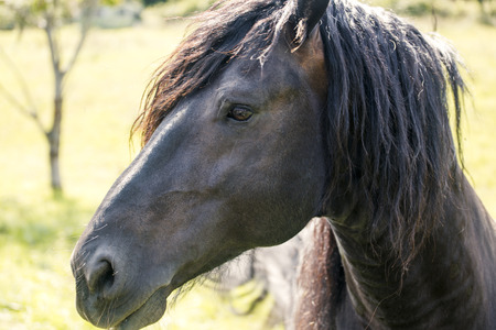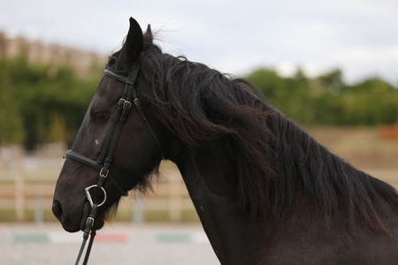 Horse portrait. Beautiful black stallion with long mane portrait.