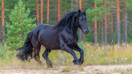 A majestic Friesian horse trotting gracefully across a sunlit pasture, mane and tail flowing in the breeze, muscles rippling beneath its sleek black coat, exuding strength and elegance