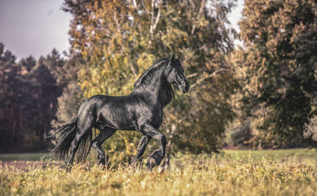 Beautiful black horse. The Friesian stallion gallops in the autumn meadow in the sun