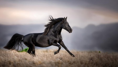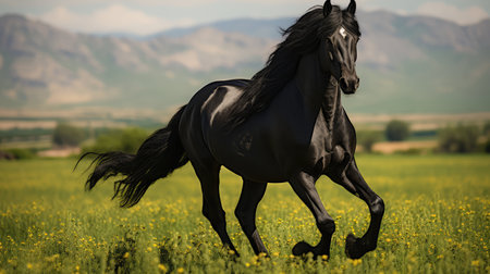 Galloping Friesian horse, digital ai.