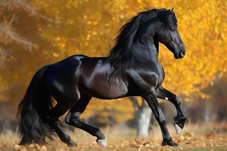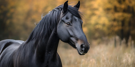 Majestic black horse standing in a field with golden autumn trees in the background