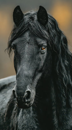 A striking black horse stands calmly its long mane gently illuminated by soft light capturing its elegant features and deep gaze.