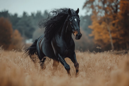 Powerful black stallion with flowing mane running through a field of dry golden grass in autumn