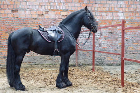 Black Friesian stallion standing against the brick wall of the stables.