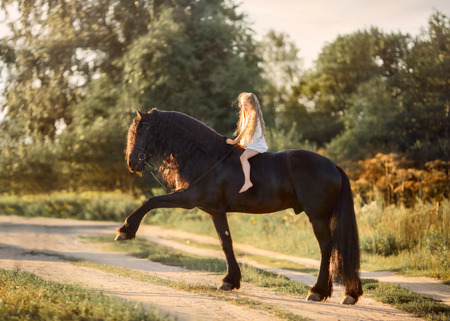 Little girl with black friesian stallion at summer evening