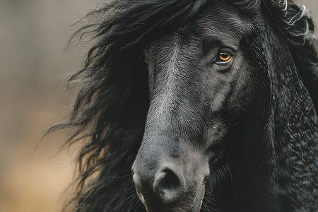 Black horse with a flowing mane and intense gaze, its majestic presence and beauty. the detailed close-up view texture of the mane and the depth in the horse's eyes, set against a blurred background. Generative AI