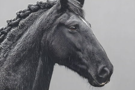 A striking black horse with a braided mane stands against a gray background, its glossy coat and expressive eye. the close-up profile emphasizes the horse's elegance and strength, making it ideal for equine art. Generative AI