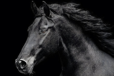 Portrait of a black horse on a black background. Monochrome.
