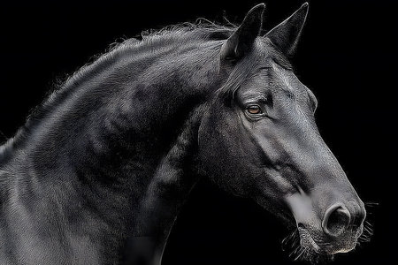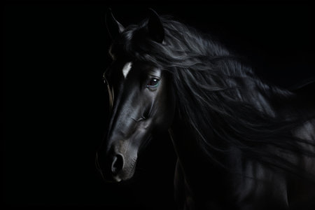 Elegant portrait of a black horse, showcasing its powerful build and flowing mane against a dark backdrop. the contrast highlights the beauty and strength of the horse, capturing a sense of freedom and grace. Generative AI
