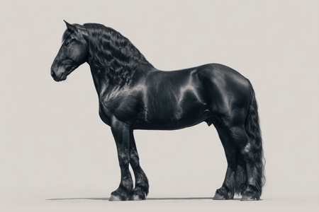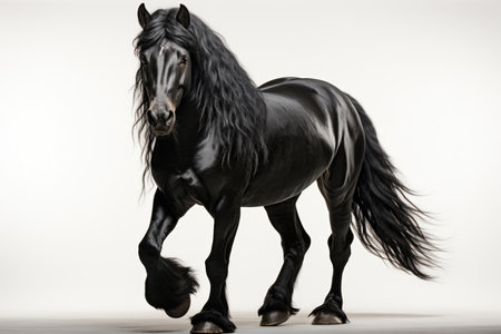 Black friesian stallion with black mane and long mane on white background