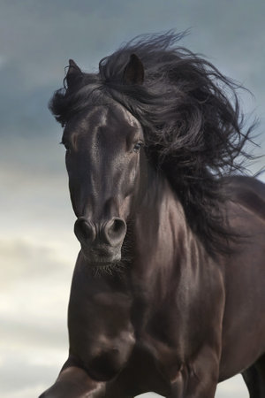 Black stallion of frisian horse gallopping