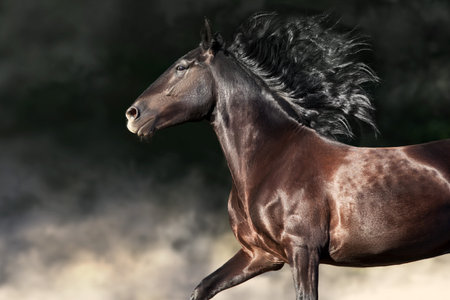 Horse with long mane in motion with dark background behind