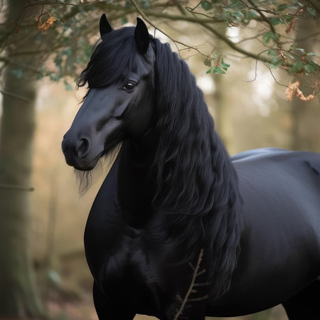 Generative AI Image of Black Horse Equine Animal with Long Hair Mane Standing in Forest
