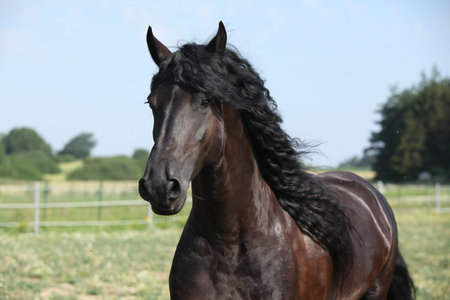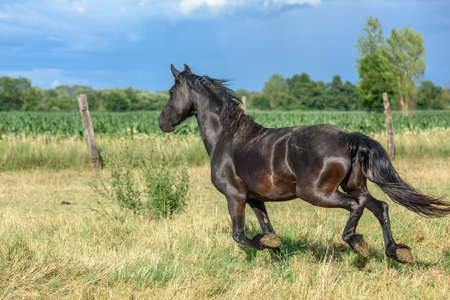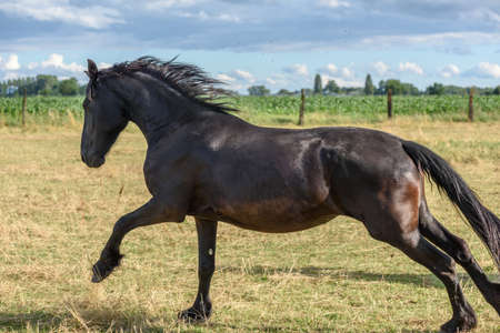 Friesian horse running on pasture at countryside. Domestic animal at farm. Beautiful stallion in rural scenery