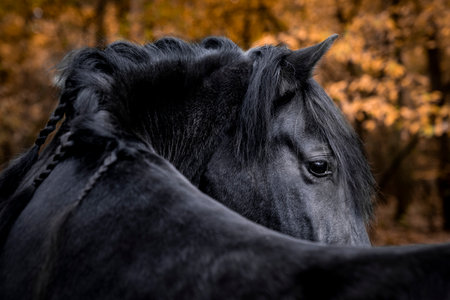 Black Friesian horse with long mane looking at camera in autumn nature